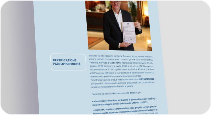 Gruppo DentalPrHighlightos__ANNUAL REPORT ANNUAL REPORT 20232023 Secondo l’ultimo rapporto del World Economic Forum, nessun Paese ha CERTIFICAZIONE ancora colmato completamente i divari di genere. Paesi come Islanda, PARI OPPORTUNITÀ Finlandia, Norvegia e Svezia hanno ridotto oltre l’80% del divario. A livello globale, il 96% del divario in salute, il 95% in istruzione, il 58% in opportu- nità economiche e il 22% in politica sono stati chiusi. L’Italia si posiziona al 63° posto su 156 Stati e al 114° posto per la partecipazione economica, evidenziando quest’ultima come la dimensione più critica. Per affrontare queste sfide, è stata introdotta la norma UNI/PdR 125:2022, una prassi di riferimento che permette alle aziende italiane di analizzare, valutare e rendicontare i dati relativi al genere. DentalPro ha deciso di lavorare in questa direzione per: • ottenere la certificazione per la parità di genere attraverso il raggiungi- mento del punteggio minimo definito dalla UNI/PdR 125:2022 • migliorare, ampliare e implementare nuovi progetti e azioni per pro- muovere equità, inclusione e un continuo miglioramento dell’ambiente di lavoro. DentalPro ha l’obiettivo di identificare azioni migliorative future, che vadano nella direzione di garantire eque opportunità di crescita, migliorare il work-life balance e perfezionare i processi aziendali. Nel frattempo, per ampliare le conoscenze su questi temi, sono stati ero- gati dei corsi di formazione su diversità e inclusione al personale medico 2121
