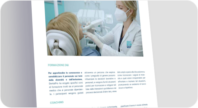 Dipendenti DentalPro_ ANNUAL REPORT 2023 FORMAZIONE D&I Per approfondire le conoscenze e attraverso un percorso che esplora dato ampio spazio alla discussione su sensibilizzare il personale sui temi come i pregiudizi di genere possano come riconoscere i segnali di mole- della diversità e dell’inclusione, influenzare le decisioni lavorative e stia e quali azioni intraprendere per DentalPro ha erogato specifici corsi personali, e vengono forniti strumenti affrontare e risolvere tali situazioni, di formazione rivolti sia al personale pratici per riconoscere e mitigare tali promuovendo un ambiente di lavoro medico che al personale dipenden- bias nelle interazioni quotidiane e nei sicuro e rispettoso. te. I partecipanti vengono guidati processi decisionali. D’altro lato, viene COACHING Nel gennaio 2023, tra le varie inizia- specifiche di ciascun partecipante, pianificare il lavoro in modo ottimale. tive formative di DentalPro, è stato garantendo un approccio su misura La direzione è quella del migliora- avviato un progetto di coaching in- per il massimo sviluppo personale e mento continuo, pertanto i risultati dividuale destinato ad alcuni ruoli professionale. Il primo passo è stato raggiunti continuano a essere co- apicali della rete e della sede cen- quindi quello di identificare i punti stantemente monitorati e incentivato trale. Il programma è stato persona- di forza e le aree di miglioramento, il lavoro sulle proprie potenzialità. lizzato per rispondere alle esigenze condivisi con il coach per orientare e 51