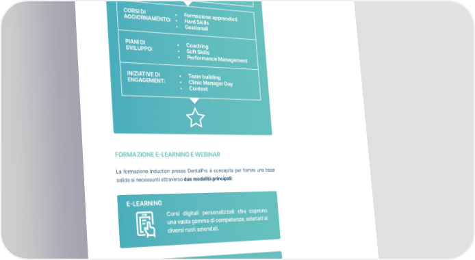 Dipendenti DentalPro_ ANNUAL REPORT 2023 INDUCTION: • Webinar • E-learning • DentalPro Training Hub CORSI DI • Formazione apprendisti AGGIORNAMENTO: • Hard Skills • Gestionali PIANI DI • Coaching SVILUPPO: • Soft Skills • Performance Management INIZIATIVE DI • Team building ENGAGEMENT: • Clinic Manager Day • Contest FORMAZIONE E-LEARNING E WEBINAR La formazione Induction presso DentalPro è concepita per fornire una base solida ai neoassunti attraverso due modalità principali: E-LEARNING Corsi digitali personalizzati che coprono una vasta gamma di competenze, adattati ai diversi ruoli aziendali. WEBINAR Sessioni online sincrone condotte da forma- tori interni, offrono un’interazione diretta e approfondimenti su temi specifici. 49
