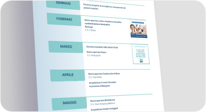 Risultati 2023 GENNAIO Partenza progetto di accoglienza consapevole dei pazienti autistici. FEBBRAIO Nuova apertura centro dentistico DentalPro e poliambulatorio MedicalPro Busnago C.C. Il Globo MARZO Giornata mondiale della Salute Orale Nuova apertura Nuoro C.C. Pratosardo APRILE Nuova apertura Casalecchio di Reno C.C. Gran Reno Acquisizione 3 centri Veradent in provincia di Bergamo MAGGIO Nuova apertura Monfalcone C.C. Gran Shopping Belforte Acquisizione Studio Caviggioli in provincia di Novara GIUGNO Acquisizione Studio Azzolina e Gozzi a Forlì 28