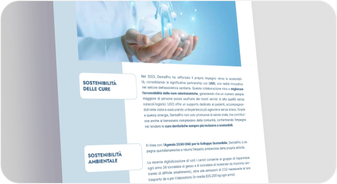 Nel 2023, DentalPro ha rafforzato il proprio impegno verso la sostenibili- SOSTENIBILITÀ tà, consolidando la significativa partnership con UGO, una realtà innovativa DELLE CURE nel settore dell’assistenza sanitaria. Questa collaborazione mira a migliorare l’accessibilità delle cure odontoiatriche, garantendo che un numero sempre maggiore di persone possa usufruire dei nostri servizi di alta qualità senza ostacoli logistici. UGO offre un supporto dedicato ai pazienti, accompagnan- doli nelle visite e assicurando un’esperienza più agevole e senza stress. Grazie a questa sinergia, DentalPro non solo promuove la salute orale, ma contribui- sce anche al benessere complessivo della comunità, confermando l’impegno nel rendere le cure dentistiche sempre più inclusive e sostenibili. In linea con l’Agenda 2030 ONU per lo Sviluppo Sostenibile, DentalPro si im- SOSTENIBILITÀ pegna quotidianamente a ridurre l’impatto ambientale della propria attività. AMBIENTALE La recente digitalizzazione di tutti i centri consente al gruppo di risparmiare ogni anno 26 tonnellate di gesso e 8 tonnellate di materiale da impronta (en- trambi di difficile smaltimento), oltre alle emissioni di CO2 necessarie al loro trasporto da e per il laboratorio (in media 835.200 kg ogni anno). 18