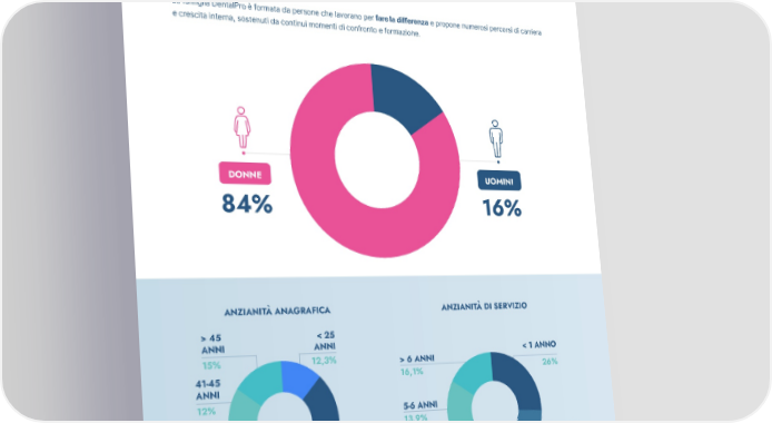 ANNUAL REPORT 2023 _Dipendenti DentalPro Identikit del dipendente I DIPENDENTI DENTALPRO La famiglia DentalPro è formata da persone che lavorano per fare la differenza e propone numerosi percorsi di carriera e crescita interna, sostenuti da continui momenti di confronto e formazione. DONNE UOMINI 84% 16% ANZIANITÀ ANAGRAFICA ANZIANITÀ DI SERVIZIO ANZIANITÀ ANAGRAFICA > 45 < 25 ANNI ANNI < 1 ANNO 15% 12,3% > 6 ANNI 41-45 16,1% 26% ANNI 12% 5-6 ANNI 13,9% 25-30 1-2 ANNI 36-40 ANNI ANNI 25,5% 3-4 ANNI 30,3% 15,5% 13,6% 31-35 ANNI 19,7% 42