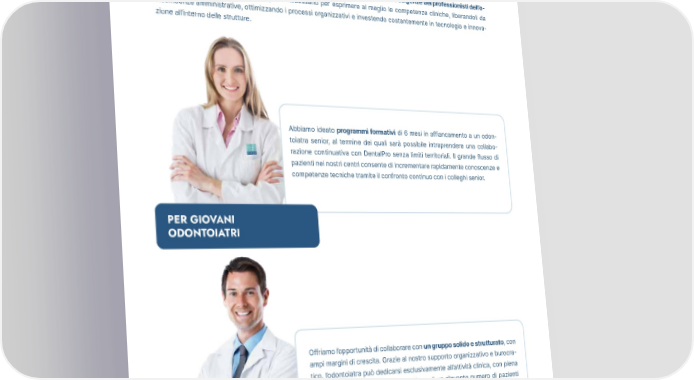 ANNUAL REPORT 2023 _Medici e professionisti DentalPro Servizi a supporto dei professionisti DentalPro si presenta oggi come un interlocutore in grado di rispondere alle diverse esigenze dei professionisti dell’o- dontoiatria, ai quali offre tutto il supporto necessario per esprimere al meglio le competenze cliniche, liberandoli da incombenze amministrative, ottimizzando i processi organizzativi e investendo costantemente in tecnologia e innova- zione all’interno delle strutture. Abbiamo ideato programmi formativi di 6 mesi in affiancamento a un odon- toiatra senior, al termine dei quali sarà possibile intraprendere una collabo- razione continuativa con DentalPro senza limiti territoriali. Il grande flusso di pazienti nei nostri centri consente di incrementare rapidamente conoscenze e competenze tecniche tramite il confronto continuo con i colleghi senior. PER GIOVANI ODONTOIATRI Offriamo l’opportunità di collaborare con un gruppo solido e strutturato, con ampi margini di crescita. Grazie al nostro supporto organizzativo e burocra- tico, l’odontoiatra può dedicarsi esclusivamente all’attività clinica, con piena autonomia sui piani di cura. La gestione di un rilevante numero di pazienti e la formazione continua permettono un’importante crescita professionale, unita al confronto peer to peer con altri colleghi esperti in tutto il gruppo DentalPro. PER ODONTOIATRI ESPERTI 38