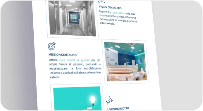 Gruppo DentalPro_ ANNUAL REPORT 2023 Cosa ci guida VISION DENTALPRO Seretrehem horavo, cultin dis, unum Essere il gruppo leader nelle cure et? Tum Patra depse fauderorbi cum odontoiatriche private, attraverso inati, Cat, que potis. Ir larestidem P. l’innovazione di servizio, processo e tecnologia. MISSION DENTALPRO Seretrehem horavo, cultin dis, unum Offrire cure dentali di qualità alla più et? Tum Patra depse fauderorbi cum ampia fascia di pazienti, puntando a inati, Cat, que potis. Ir larestidem P. massimizzare la loro soddisfazione insieme a quella di collaboratori e partner esterni. Seretrehem horavo, cultin dis, unum et? Tum Patra depse fauderorbi cum IL NOSTRO MOTTO inati, Cat, que potis. Ir larestidem P. “Sky is the limit”, perchè la crescita del gruppo, delle persone e delle competenze deve essere un’ambizione continua, in tutto ciò che facciamo. 5