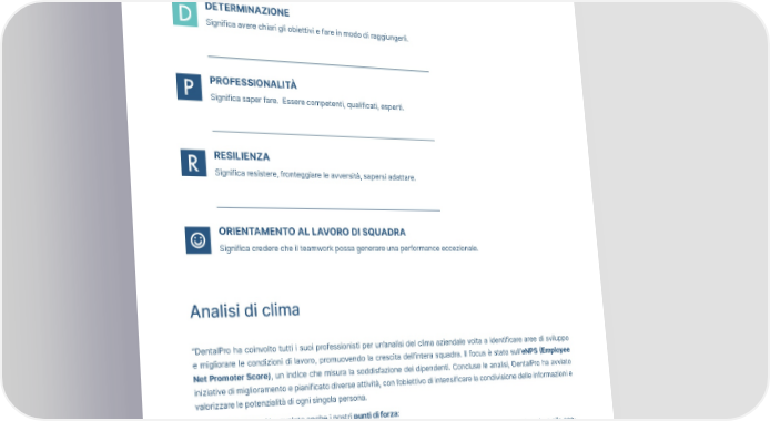 ANNUAL REPORT 2023 _Dipendenti DentalPro Cultura aziendale LA CARTA DEI VALORI DENTALPRO DETERMINAZIONE Significa avere chiari gli obiettivi e fare in modo di raggiungerli. PROFESSIONALITÀ Significa saper fare. Essere competenti, qualificati, esperti. RESILIENZA Significa resistere, fronteggiare le avversità, sapersi adattare. ORIENTAMENTO AL LAVORO DI SQUADRA Significa credere che il teamwork possa generare una performance eccezionale. Analisi di clima “DentalPro ha coinvolto tutti i suoi professionisti per un’analisi del clima aziendale volta a identificare aree di sviluppo e migliorare le condizioni di lavoro, promuovendo la crescita dell’intera squadra. Il focus è stato sull’eNPS (Employee Net Promoter Score), un indice che misura la soddisfazione dei dipendenti. Concluse le analisi, DentalPro ha avviato iniziative di miglioramento e pianificato diverse attività, con l’obiettivo di intensificare la condivisione delle informazioni e valorizzare le potenzialità di ogni singola persona. La lettura dei dati ci ha svelato anche i nostri punti di forza: • Spirito di squadra con riferimento alle relazioni con i colleghi, al supporto percepito, al coinvolgimento e alla coe- sione; • Leadership e coinvolgimento, ossia riconoscimento e disponibilità del responsabile e libertà di espressione e con- fronto; • Immagini e valori, con riferimento alla responsabilità sociale, all’attenzione al paziente e all’orgoglio sociale che deriva dall’operare nel settore sanitario. 46