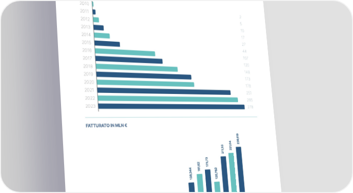Highlights_ ANNUAL REPORT 2023 Crescita del gruppo NUMERO CENTRI 2010 2 2011 5 2012 10 2013 17 2014 27 2015 44 2016 107 2017 120 2018 148 2019 173 2020 178 2021 251 2022 265 2023 278 FATTURATO IN MLN € 23