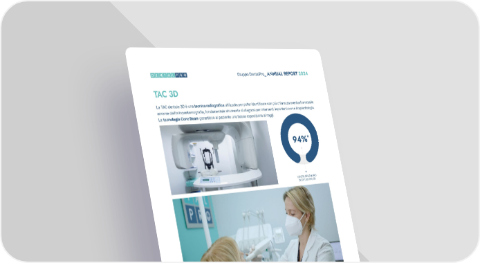 29 Gruppo DentalPro_ ANNUAL REPORT 2024 La TAC dentale 3D è una tecnica radiografica utilizzata per poter identificare con più chiarezza eventuali anomalie emerse dall’ortopantomografia, fondamentale strumento di diagnosi per interventi importanti come l’implantologia. La tecnologia Cone Beam garantisce al paziente una bassa esposizione ai raggi. SCANNER INTRAORALI TAC 3D L’impiego di scanner intraorali è di grande utilità sia in campo protesico sia in quello dell’ortodonzia tradizionale e trasparente: consente di acquisire im- pronte in 3D di elevata qualità e precisione, risparmiando tempo e velociz- zando la comunicazione con il laboratorio, per un’esecuzione a regola d’arte di manufatti protesici anche complessi. Soprattutto, offre maggiore comfort ai pazienti, che eviteranno la poco gradita pasta da impronta e potranno com- prendere meglio lo stato della loro salute dentale: l’impronta digitale, infatti, consente di mostrare a schermo in tempo reale aree di interesse, proposte e fasi di trattamento. Il Gruppo DentalPro ha concluso il processo di digitalizzazione delle proprie strutture introducendo in tutti gli oltre 280 centri moderni scanner intraorali con l’obiettivo di offrire trattamenti sempre più all’avanguardia e una migliore patient experience, fin dalla prima visita. Oggi, in tutti i centri DentalPro, sono state effettuate oltre 150.000 scansioni e quasi il 95% del totale impronte è acquisito in digitale.* *Dati aggiornati al 2024 94%* CENTRI DENTALPRO DOTATI DI TAC 3D 100%* CENTRI DENTALPRO DOTATI DI SCANNER INTRAORALE