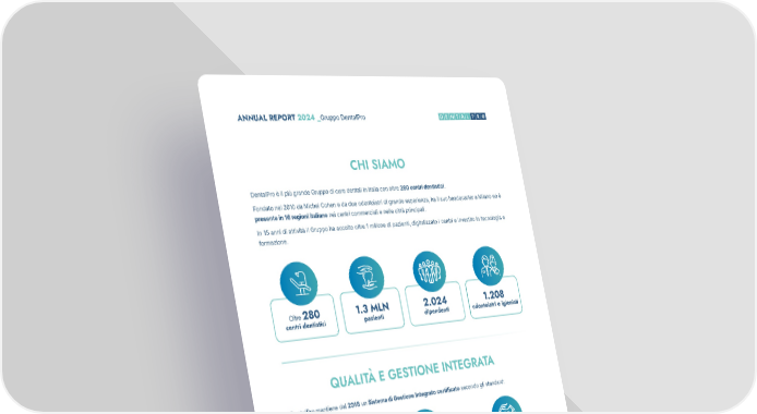 10 ANNUAL REPORT 2024 _Gruppo DentalPro Questo modello, applicato sia ai centri odontoiatrici sia alla Academy interna, consente di: • Migliorare la sicurezza, riducendo il rischio di incidenti grazie a un approccio preventivo. • Ottimizzare le performance aziendali, integrando la gestione di rischi e opportunità nei diversi processi aziendali. • Facilitare l’integrazione di nuove strutture, fornendo un quadro normativo e operativo chiaro nei processi di M&A. • Rafforzare la reputazione del Gruppo, dimostrando l’impegno verso qualità, sicurezza e sostenibilità, a beneficio di dipendenti, pazienti e stakeholder. L’adozione di questo sistema testimonia la volontà di DentalPro di garantire standard elevati e un continuo miglio- ramento dei processi. DentalPro è il più grande Gruppo di cure dentali in Italia con oltre 280 centri dentistici. Fondato nel 2010 da Michel Cohen e da due odontoiatri di grande esperienza, ha il suo headquarter a Milano ed è presente in 16 regioni italiane nei centri commerciali e nelle città principali. In 15 anni di attività il Gruppo ha accolto oltre 1 milione di pazienti, digitalizzato i centri e investito in tecnologia e formazione. CHI SIAMO QUALITÀ E GESTIONE INTEGRATA Oltre 280 centri dentistici 1.3 MLN pazienti 2.024 dipendenti 1.208 odontoiatri e igienisti ISO 9001:2015 Gestione della qualità ISO 14001:2015 Gestione ambiente ISO 45001:2018 Salute e sicurezza sul lavoro DentalPro mantiene dal 2018 un Sistema di Gestione Integrato certificato secondo gli standard: