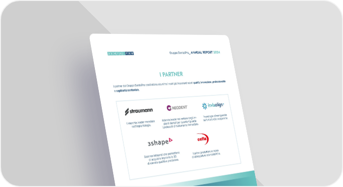 31 Gruppo DentalPro_ ANNUAL REPORT 2024 I PARTNER I partner del Gruppo DentalPro condividono alcuni tra i nostri più importanti valori: qualità, innovazione, professionalità e capillarità territoriale. Scanner Intraorali che permettono di acquisire impronte in 3D di elevata qualità e precisione. Il primo produttore europeo di attrezzature odontoiatriche. Il marchio leader mondiale nell’implantologia. Azienda leader nel settore degli im- pianti dentali per quanto riguarda i protocolli di trattamento immediato. Tecnologia all’avanguardia nell’ortodonzia trasparente. DISTRIBUTORI PARTNER DENTALPRO