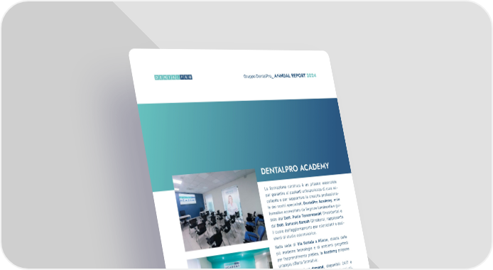 45 Gruppo DentalPro_ ANNUAL REPORT 2024 La formazione continua è un pilastro essenziale per garantire ai pazienti un’esperienza di cura ec- cellente e per supportare la crescita professiona- le dei nostri specialisti. DentalPro Academy, ente formativo accreditato da Regione Lombardia e gui- dato dal Dott. Paolo Tonveronachi (Presidente) e dal Dott. Samuele Baruch (Direttore), rappresenta il cuore dell’aggiornamento per odontoiatri e assi- stenti di studio odontoiatrico. Nella sede di Via Settala a Milano, dotata delle più moderne tecnologie e di ambienti progettati per l’apprendimento pratico, la Academy propone un’ampia offerta formativa: • Videolezioni on-demand, disponibili 24/7 e costantemente aggiornate con nuovi casi cli- nici. • Corsi di abilitazione per assistenti di studio odontoiatrico, con percorsi da 700 ore (300 di teoria e 400 di tirocinio in centri convenzio- nati). • Corsi ECM, finalizzati a garantire il continuo aggiornamento formativo dei professionisti se- condo la normativa vigente. Nel 2024, DentalPro Academy ha erogato 25 corsi di formazione per odontoiatri, per un totale di oltre 40.000 ore di formazione, preparando 1.000 odon- toiatri e assistenti di studio odontoiatrico. Guardando al futuro, l’obiettivo è chiaro: consolida- re il ruolo della Academy come ponte tra il mondo accademico e quello professionale, attraverso colla- borazioni con università e istituzioni di settore, per formare i migliori specialisti di domani. DENTALPRO ACADEMY