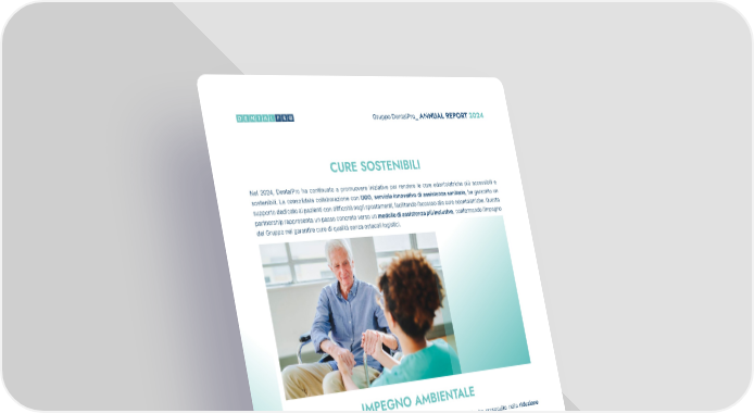 33 Gruppo DentalPro_ ANNUAL REPORT 2024 Nel 2024, DentalPro ha continuato a promuovere iniziative per rendere le cure odontoiatriche più accessibili e sostenibili. La consolidata collaborazione con UGO, servizio innovativo di assistenza sanitaria, ha garantito un supporto dedicato ai pazienti con difficoltà negli spostamenti, facilitando l’accesso alle cure odontoiatriche. Questa partnership rappresenta un passo concreto verso un modello di assistenza più inclusivo, confermando l’impegno del Gruppo nel garantire cure di qualità senza ostacoli logistici. In linea con gli obiettivi dell’Agenda 2030 per lo Sviluppo Sostenibile, DentalPro ha proseguito nella riduzione dell’impatto ambientale delle proprie attività. Grazie alla digitalizzazione dei processi, il Gruppo risparmia annualmente 26 tonnellate di gesso e 8 tonnellate di materiale da impronta, materiali difficili da smaltire, oltre a ridurre le emissioni di CO₂ derivanti dal loro trasporto (pari a circa 835.200 kg ogni anno). Questo approccio innovativo consente di ridurre significativamente gli sprechi e ottimizzare le risorse, contri- buendo attivamente alla sostenibilità ambientale. CURE SOSTENIBILI IMPEGNO AMBIENTALE